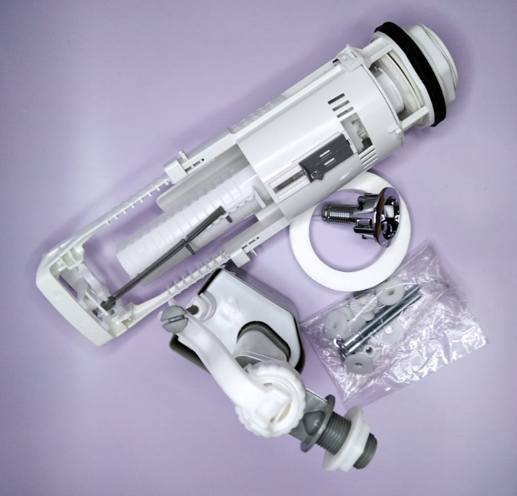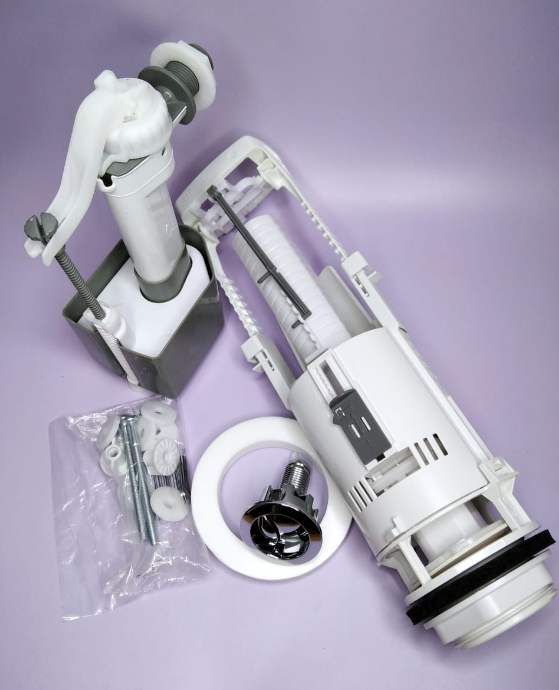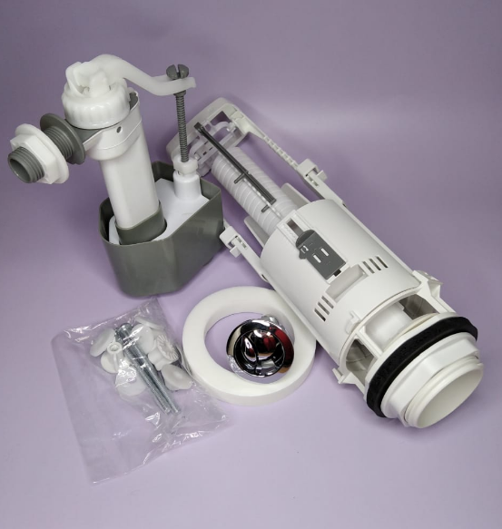 В комплект поставки входит: сливной и заливной механизмы, прокладка между бачком и унитазом, крепежные болты и кнопка сливного механизма.